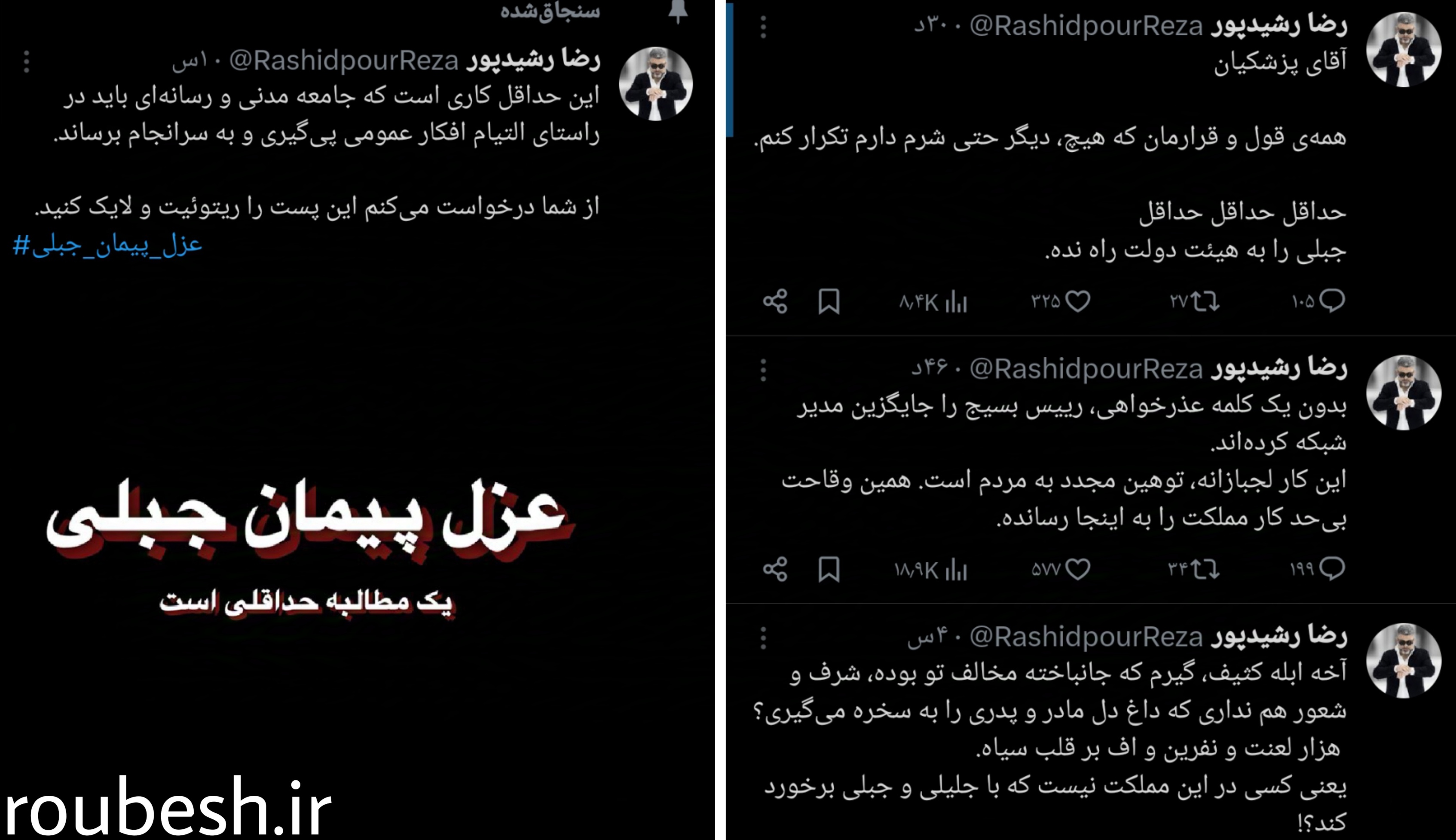 🔅و اما در میان تمامی واکنشهای تند و هیجانی چهرهها، رضا رشیدپور بعد از یک هفته سکوت و آن پیامِ حلالیت طلبیدنش از خانوادههای داغدار کشتهشدگان اغتشاشات اخیر؛ هشتگ عزل رئیس صداوسیما را در شبکه اینستاگرام و شبکه اجتماعی ایکس بهراه انداخته تا تسویهحسابهای شخصیاش را با ژستِ التیامِ افکار عمومی پیش ببرد!